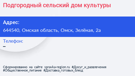 Подгородный, сельский дом культуры по адресу 644540, Омская область, Омск, Зелёная, 2а в дальнейшем Организация, размещена в следующих категориях: