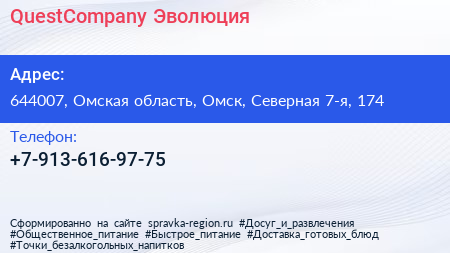 QuestCompany Эволюция по адресу 644007, Омская область, Омск, Северная 7-я, 174 в дальнейшем Организация, размещена в следующих категориях: