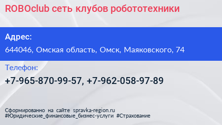 ROBOclub, сеть клубов робототехники по адресу 644046, Омская область, Омск, Маяковского, 74 в дальнейшем Организация, размещена в следующих категориях: