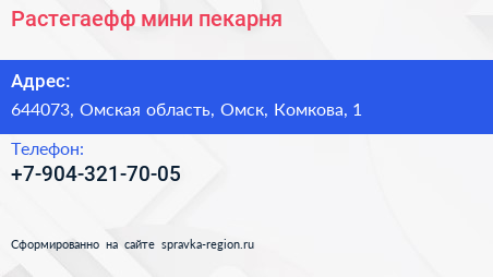 Растегаефф, мини-пекарня по адресу 644073, Омская область, Омск, Комкова, 1 в дальнейшем Организация, размещена в следующих категориях: