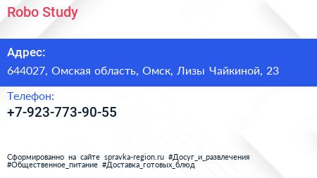 Robo Study по адресу 644027, Омская область, Омск, Лизы Чайкиной, 23 в дальнейшем Организация, размещена в следующих категориях: