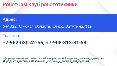 РоботСам, клуб робототехники по адресу 644022, Омская область, Омск, Ватутина, 11в в дальнейшем Организация, размещена в следующих категориях: