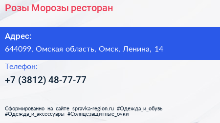 Розы Морозы, ресторан по адресу 644099, Омская область, Омск, Ленина, 14 в дальнейшем Организация, размещена в следующих категориях: