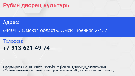 Рубин, дворец культуры по адресу 644041, Омская область, Омск, Военная 2-я, 2 в дальнейшем Организация, размещена в следующих категориях: