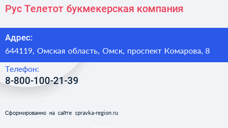 Рус-Телетот, букмекерская компания по адресу 644119, Омская область, Омск, проспект Комарова, 8 в дальнейшем Организация, размещена в следующих категориях: