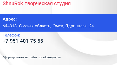 ShnuRok, творческая студия по адресу 644013, Омская область, Омск, Ядринцева, 24 в дальнейшем Организация, размещена в следующих категориях: