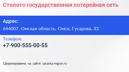 Столото, государственная лотерейная сеть по адресу 644007, Омская область, Омск, Гусарова, 33 в дальнейшем Организация, размещена в следующих категориях: