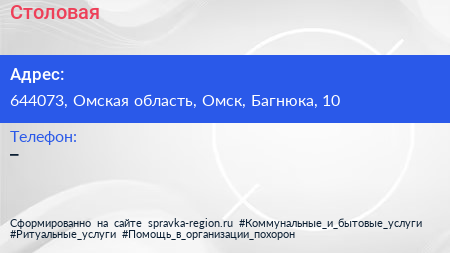 Столовая по адресу 644073, Омская область, Омск, Багнюка, 10 в дальнейшем Организация, размещена в следующих категориях:
