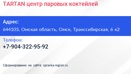 TARTAN, центр паровых коктейлей по адресу 644103, Омская область, Омск, Транссибирская, 6 к2 в дальнейшем Организация, размещена в следующих категориях: