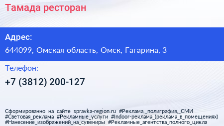 Тамада, ресторан по адресу 644099, Омская область, Омск, Гагарина, 3 в дальнейшем Организация, размещена в следующих категориях: