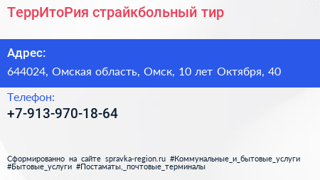 ТеррИтоРия, страйкбольный тир по адресу 644024, Омская область, Омск, 10 лет Октября, 40 в дальнейшем Организация, размещена в следующих категориях: