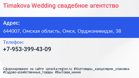 Timakova Wedding, свадебное агентство по адресу 644007, Омская область, Омск, Орджоникидзе, 38 в дальнейшем Организация, размещена в следующих категориях: