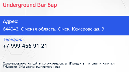 Underground Bar, бар по адресу 644043, Омская область, Омск, Кемеровская, 9 в дальнейшем Организация, размещена в следующих категориях: