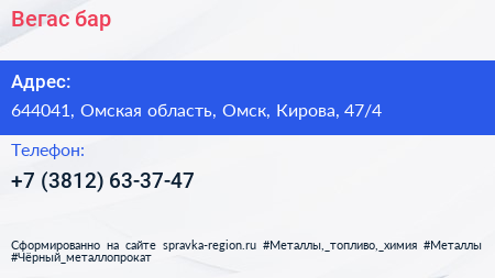 Вегас, бар по адресу 644041, Омская область, Омск, Кирова, 47/4 в дальнейшем Организация, размещена в следующих категориях: