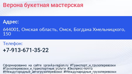 Верона, букетная мастерская по адресу 644001, Омская область, Омск, Богдана Хмельницкого, 150 в дальнейшем Организация, размещена в следующих категориях: