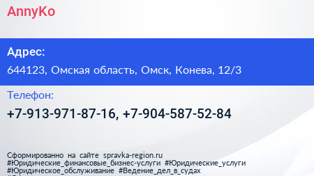 AnnyKo по адресу 644123, Омская область, Омск, Конева, 12/3 в дальнейшем Организация, размещена в следующих категориях: