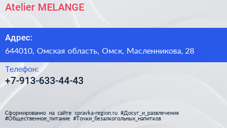 Atelier MELANGE по адресу 644010, Омская область, Омск, Масленникова, 28 в дальнейшем Организация, размещена в следующих категориях:
