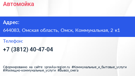 Автомойка по адресу 644083, Омская область, Омск, Коммунальная, 2 к1 в дальнейшем Организация, размещена в следующих категориях: