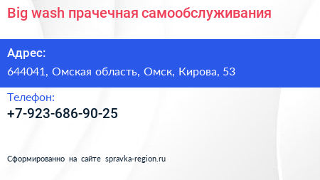 Big wash, прачечная самообслуживания по адресу 644041, Омская область, Омск, Кирова, 53 в дальнейшем Организация, размещена в следующих категориях: