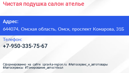 Чистая подушка, салон-ателье по адресу 644074, Омская область, Омск, проспект Комарова, 31Б в дальнейшем Организация, размещена в следующих категориях: