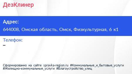 ДезКлинер по адресу 644008, Омская область, Омск, Физкультурная, 6 к1 в дальнейшем Организация, размещена в следующих категориях: