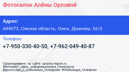 Фотосалон Алёны Орловой по адресу 644073, Омская область, Омск, Дианова, 16/2 в дальнейшем Организация, размещена в следующих категориях: