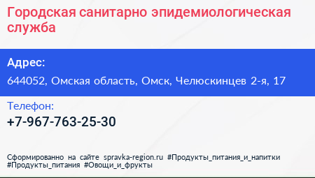 Городская санитарно-эпидемиологическая служба по адресу 644052, Омская область, Омск, Челюскинцев 2-я, 17 в дальнейшем Организация, размещена в следующих категориях: