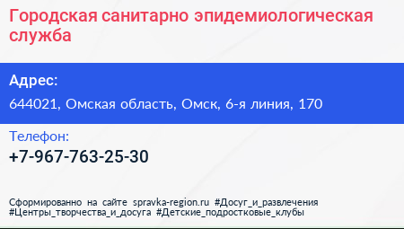 Городская санитарно-эпидемиологическая служба по адресу 644021, Омская область, Омск, 6-я линия, 170 в дальнейшем Организация, размещена в следующих категориях: