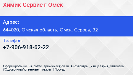 Химик-Сервис, г. Омск по адресу 644020, Омская область, Омск, Серова, 32 в дальнейшем Организация, размещена в следующих категориях: