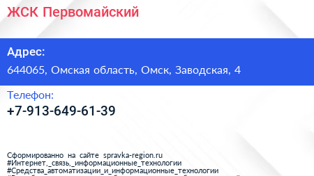 ЖСК Первомайский по адресу 644065, Омская область, Омск, Заводская, 4 в дальнейшем Организация, размещена в следующих категориях: