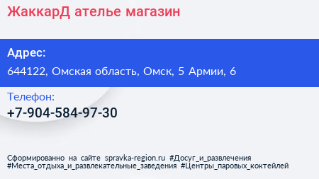 ЖаккарД, ателье-магазин по адресу 644122, Омская область, Омск, 5 Армии, 6 в дальнейшем Организация, размещена в следующих категориях: