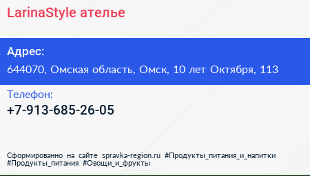 LarinaStyle, ателье по адресу 644070, Омская область, Омск, 10 лет Октября, 113 в дальнейшем Организация, размещена в следующих категориях: