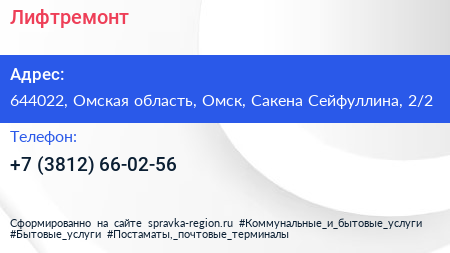 Лифтремонт по адресу 644022, Омская область, Омск, Сакена Сейфуллина, 2/2 в дальнейшем Организация, размещена в следующих категориях: