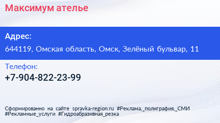Максимум, ателье по адресу 644119, Омская область, Омск, Зелёный бульвар, 11 в дальнейшем Организация, размещена в следующих категориях: