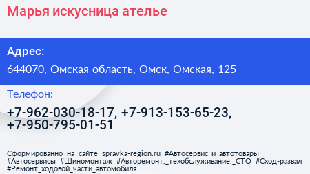 Марья-искусница, ателье по адресу 644070, Омская область, Омск, Омская, 125 в дальнейшем Организация, размещена в следующих категориях: