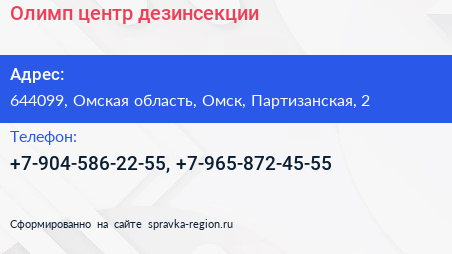 Олимп, центр дезинсекции по адресу 644099, Омская область, Омск, Партизанская, 2 в дальнейшем Организация, размещена в следующих категориях: