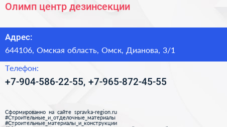 Олимп, центр дезинсекции по адресу 644106, Омская область, Омск, Дианова, 3/1 в дальнейшем Организация, размещена в следующих категориях: