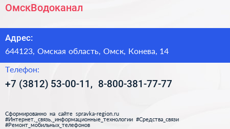 ОмскВодоканал по адресу 644123, Омская область, Омск, Конева, 14 в дальнейшем Организация, размещена в следующих категориях:
