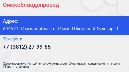 Омскоблводопровод по адресу 644521, Омская область, Омск, Школьный бульвар, 1 в дальнейшем Организация, размещена в следующих категориях: