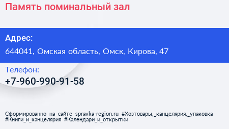 Память, поминальный зал по адресу 644041, Омская область, Омск, Кирова, 47 в дальнейшем Организация, размещена в следующих категориях: