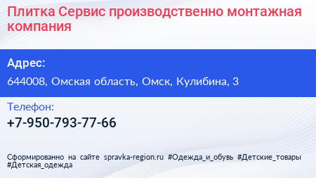 Плитка Сервис, производственно-монтажная компания по адресу 644008, Омская область, Омск, Кулибина, 3 в дальнейшем Организация, размещена в следующих категориях: