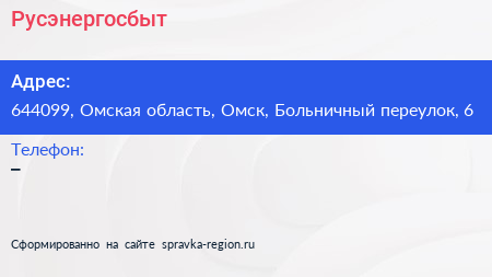 Русэнергосбыт по адресу 644099, Омская область, Омск, Больничный переулок, 6 в дальнейшем Организация, размещена в следующих категориях: