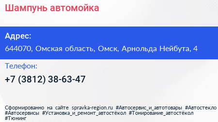Шампунь, автомойка по адресу 644070, Омская область, Омск, Арнольда Нейбута, 4 в дальнейшем Организация, размещена в следующих категориях: