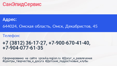 СанЭпидСервис по адресу 644024, Омская область, Омск, Декабристов, 45 в дальнейшем Организация, размещена в следующих категориях: