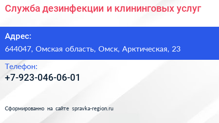 Служба дезинфекции и клининговых услуг по адресу 644047, Омская область, Омск, Арктическая, 23 в дальнейшем Организация, размещена в следующих категориях: