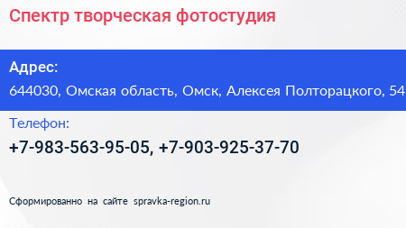 Спектр, творческая фотостудия по адресу 644030, Омская область, Омск, Алексея Полторацкого, 54 в дальнейшем Организация, размещена в следующих категориях: