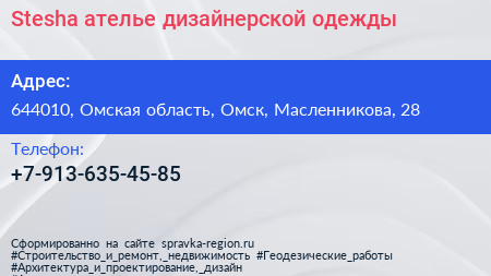 Stesha, ателье дизайнерской одежды по адресу 644010, Омская область, Омск, Масленникова, 28 в дальнейшем Организация, размещена в следующих категориях: