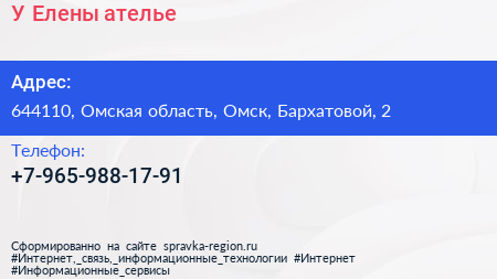 У Елены, ателье по адресу 644110, Омская область, Омск, Бархатовой, 2 в дальнейшем Организация, размещена в следующих категориях: