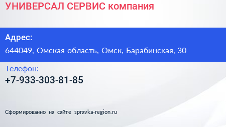 УНИВЕРСАЛ СЕРВИС, компания по адресу 644049, Омская область, Омск, Барабинская, 30 в дальнейшем Организация, размещена в следующих категориях: