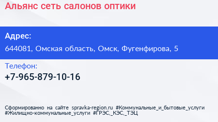 Альянс, сеть салонов оптики по адресу 644081, Омская область, Омск, Фугенфирова, 5 в дальнейшем Организация, размещена в следующих категориях:
